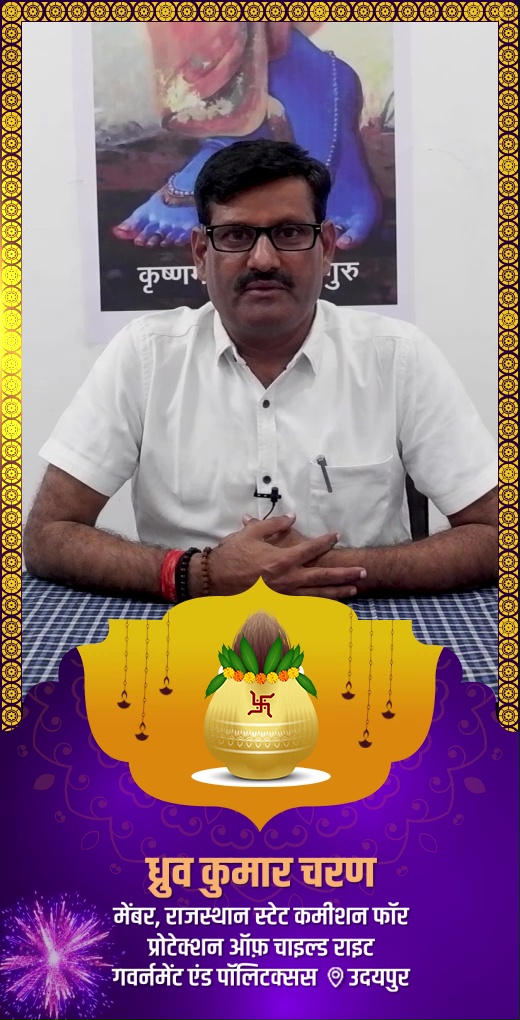 Dhruw Kumar Charan, Member of the Rajasthan State Commission for Protection of Child Rights, extends his warm Diwali wishes to all. He emphasizes the vital need for adults to understand their responsibilities toward children. His message to children is to recognize their role in shaping the nation's future, to make wise life choices, to stay away from harmful influences, and to comprehend the true significance of Diwali, which is encapsulated in the Sanskrit mantra:ॐ असतो मा सद्गमयतमसो मा ज्योतिर्गमयमृत्योर्मा अमृतं गमयॐ शान्तिः शान्तिः शान्तिः, which means, “Lead me from the unreal to the real, Lead me from darkness to light, Lead me from death to immortality. Om Shanti, Shanti, Shanti!.
